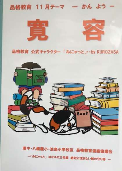 11月の品格教育のテーマは「寛容」です。辞書によりますと、「 心が広くて、よく人の言動を受け入れること。他の罪や欠点などをきびしく責めないこと。」とありました。