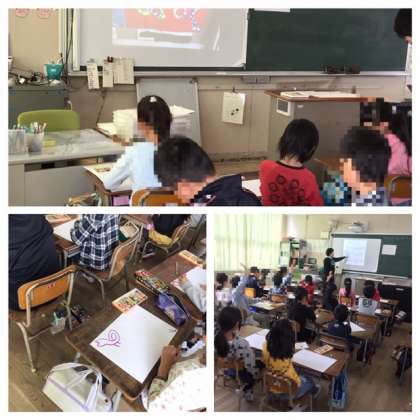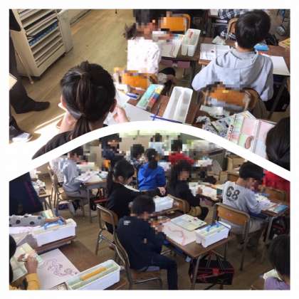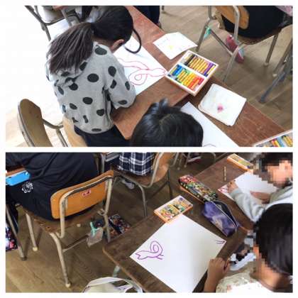 3年生の図画工作の授業がありました。「カラフルへびさん」です。ゆっくり、カタツムリの速さで線をひいて、くるくる回ったへびさんを描いて、色付けは水彩絵の具で行います。完成が楽しみです。