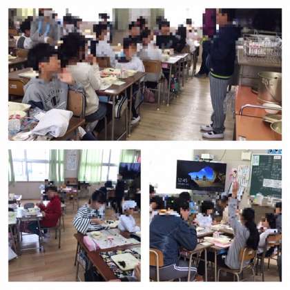 今日はふれあい給食です。1年生と6年生、2年生と4年生、3年生と5年生がそれぞれの教室に訪問して一緒に給食をいただきます。1.2年生の子は少し緊張気味に食べていました。