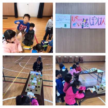 2年生の生活科の学習に、港保育所のお友達が来てくれました。講堂で、2年生が手作りしたおもちゃで遊んでいました。2年生が優しく遊び方や待ち方を教えて、お友達はとても楽しいと言ってくれました。
