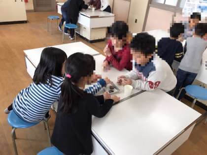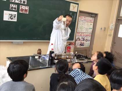 しょうゆの材料には、大豆、塩、小麦とこうじ菌が必要だそうです。材料に触れたり、発酵したしょうゆの絞り方を見たりしました。最後に諸味と出来たてしょうゆ、市販のしょうゆの味比べもさせてもらいました。
