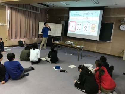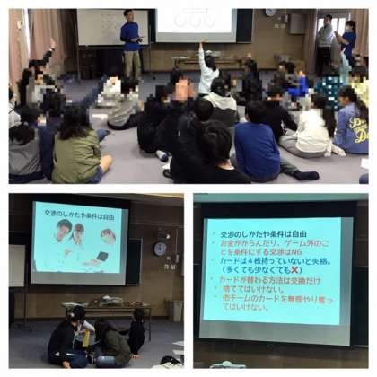 いよいよカードと指令書を使ったゲームです。自分達の情報と相手の情報をうまくやりとりして、できるだけ得点を高めるのですが、なかなか大変です。子ども達は、他の班と交渉してカードを交換し、得点を伸ばそうと頑張っていました。
