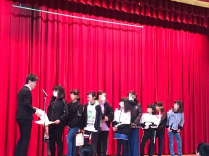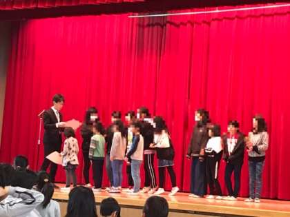 かけ足運動で、目標を達成した、1.2年生の人と、キックベースボールで準優勝した子ども会チームの人たちの表彰がありました。