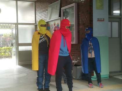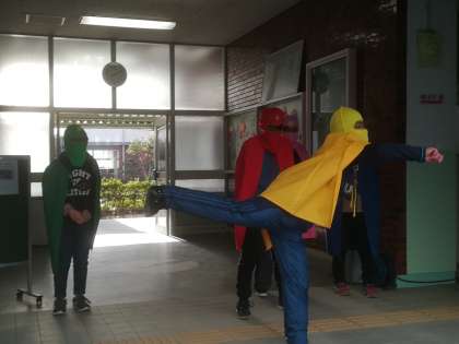 今週は、姿勢強調週間です。正しい姿勢で、学習や生活にのぞんでほしいという願いを込めて、「姿勢戦隊タダスンジャー」が登場してくれました。これから毎朝、子ども達に姿勢についてただしてくれます。