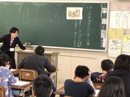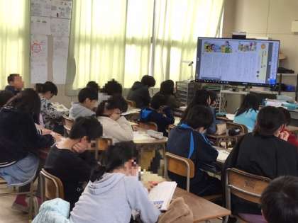 5年生は、道徳「くずれ落ちただんボール箱」です。落ち着いた雰囲気の中で本文の範読を聞き考えていました。