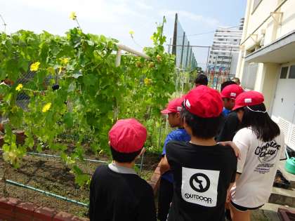 5年生の理科の時間は「ヘチマの花から実ができる」という事実を予想と観察で学習していました。観察は休憩時間になってからも続いています。