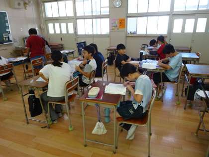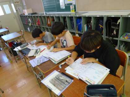 6年生が算数の時間に「拡大図と縮図」の学習をしていました。三角形の拡大図や縮図は比較的簡単にできています。応用課題で、瀬戸大橋の長さを調べるのは難しいようです。自由進度学習で進めていました。