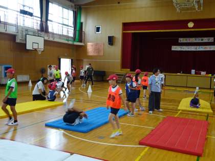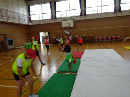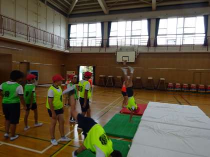 5.6年生が講堂でマット運動の学習をしていました。倒立系の運動にも挑戦しています。腕支持倒立ができるようにがんばっています。