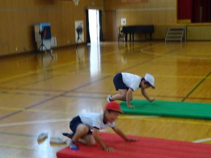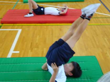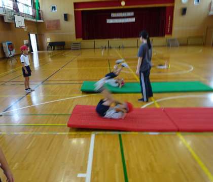 3年生が体育館でマット運動をしていました。感覚づくりの運動の後、後転を中心に回転系の運動をしていました。