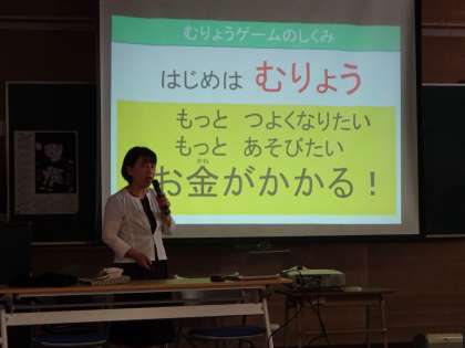 教えてくださったのは、甲南女子大学の富田先生です。1・2年生にもわかりやすく教えてくださいました。みんな真剣に聞いています。