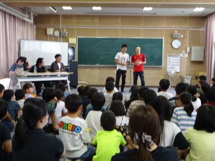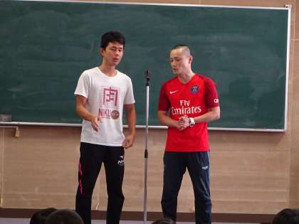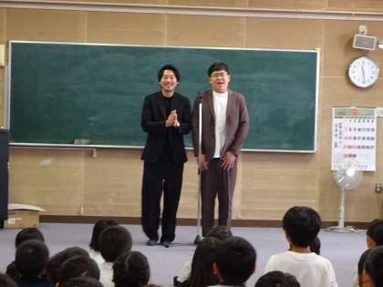 おおとりは、担任の先生による「ミルクティーボーイ」の漫才です。とても洗練されていて最高に盛り上がりました。そして、プロのコンビ「タチマチ」による漫才を見せていただきました。