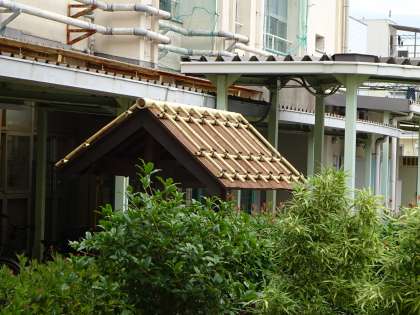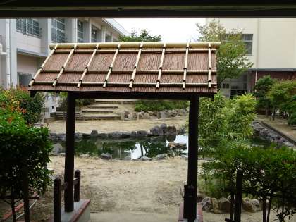 池島小学校のシンボルの池に入るための門の屋根を新しく吹き替えました。ピカピカのなったので、見に来てください。