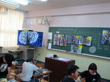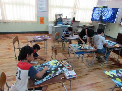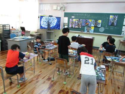 3年生が描いている「モチモチの木」の絵に、美しい光がともってきました。まもなく物語の世界が完成しそうです。
