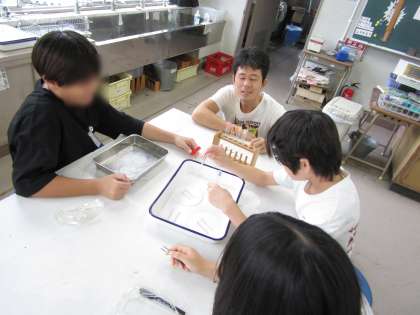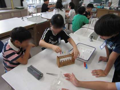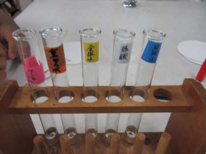 6年生が、水溶液の酸性とアルカリ性を調べていました。一番簡単にわかる方法としてリトマス紙を使って知らばています。リトマス紙は、ピンセットで取り出すのが基本らしいです。