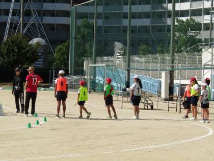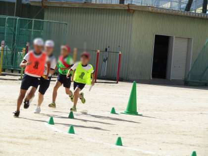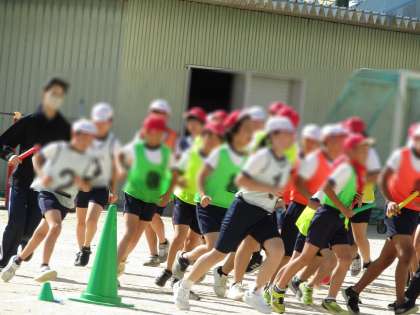 5・6年生が運動会でおこなう「紅白対抗リレー」の練習をしていました。バトンパスが見所です。どちらのチームが勝ちますでしょうか?