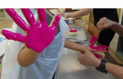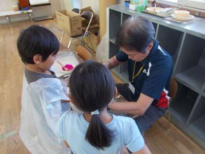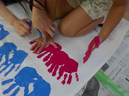 全校作品に1・2年生が参加しました。手にたっぷり絵の具をつけてぺったんこしました。