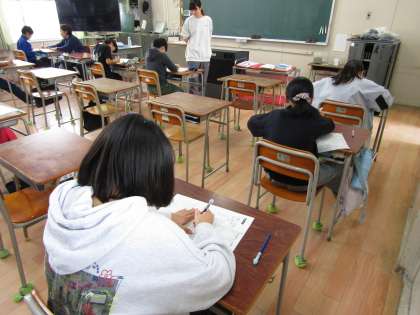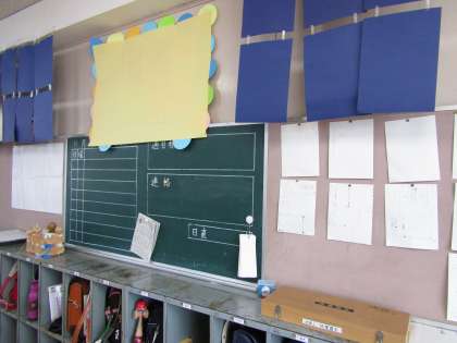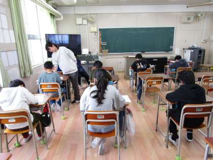 日頃の勉強の成果を試す時が来ました。子どもたちは、今年の受検級を確認していどみます。教室は漢字が見えないようにマスキング済みです。