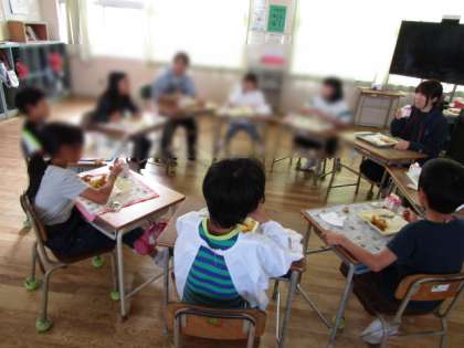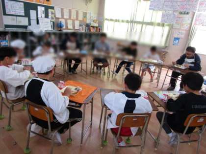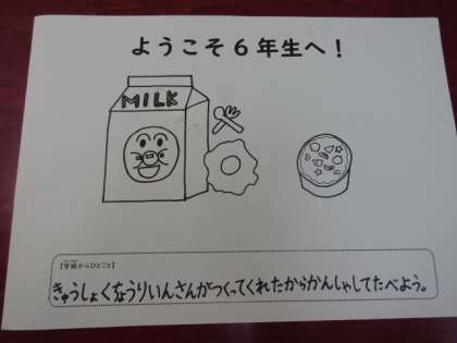 今日はふれあい給食です。1年生と6年生、3年生と5年生、2年生と4年生が教室を移動していっしょに給食をいただきます。一緒に給食を食べて、そのままクイズや出し物をして遊びます。