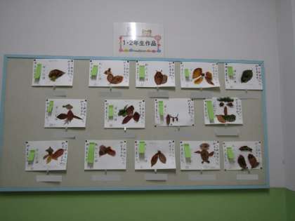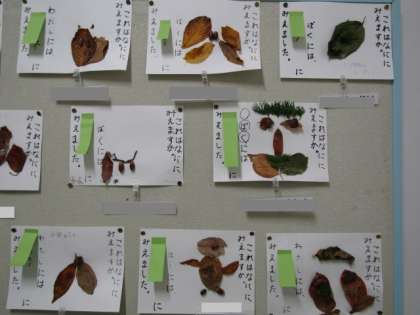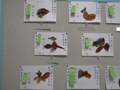 1年生が作った作品です。落ち葉やドングリを使って作りました。何に見えますか?