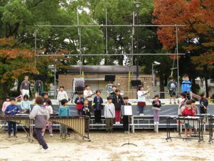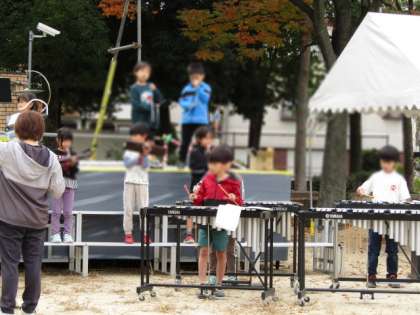 池島公園の舞台を使わせてもらって、本番通りの時間帯で練習しました。低学年は少し緊張気味です。