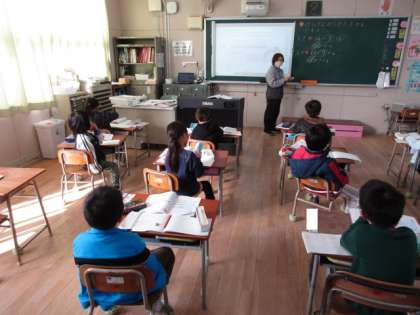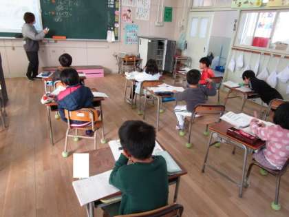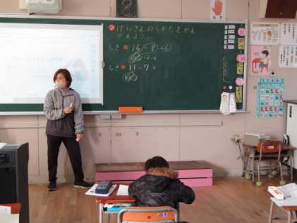 1年生が「くりさがりのあるひきざん」の学習をしていました。14を10と4にわけて・・減加法をつかって解いています。サクランボをかいて考えていました。