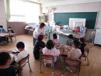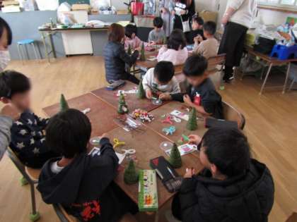 1・2年生が、生涯学習ルームのみなさんにクリスマスツリーの作り方を教えていただきました。ボンドをつけたり小さいパーツを扱ったり、少し難しかったですが、かわいい作品ができました。