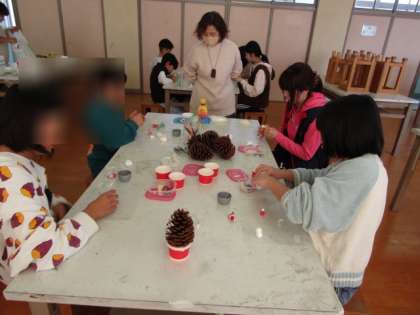 4年生も、生涯学習ルームのみなさんに大きな松ぼっくりを使ったクリスマスツリーの作り方を教えていただきました。作業が難しいですが、とてもじょうずにできました。