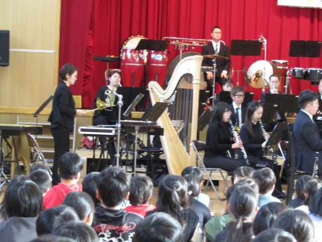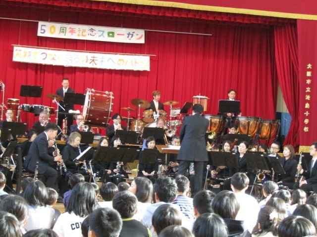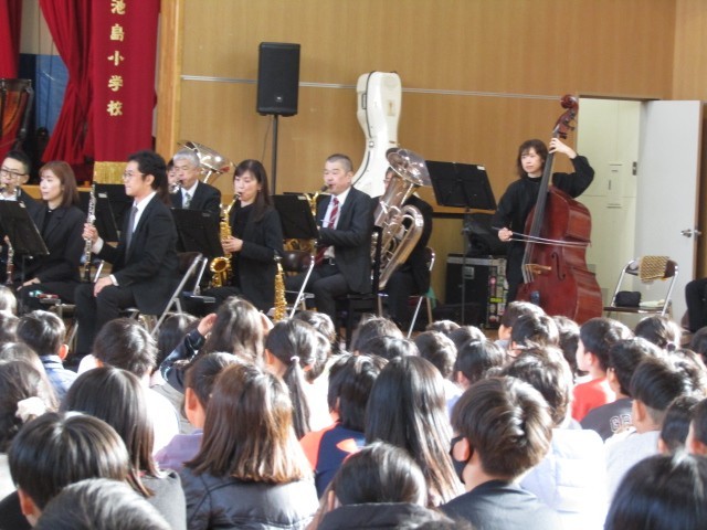 今日は、文化庁の舞台芸術等総合支援事業でシエナウインドオーケストラの皆さんが池島小学校に来てくださいました。ワールドミュージックツアーと題して、1曲目は「オリンピック・スピリット」です。