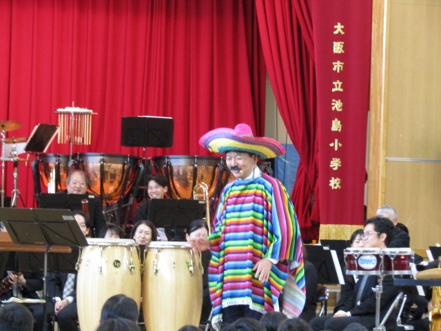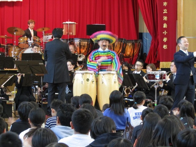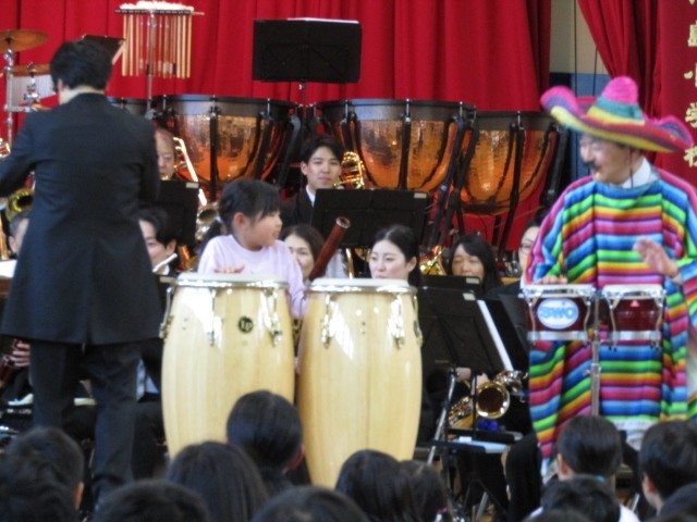 体験コーナーでは、コンガ体験をさせていただきました。ゲストにミスターリズムーチョをお迎えして、子どもたちも先生も体験をしました。
