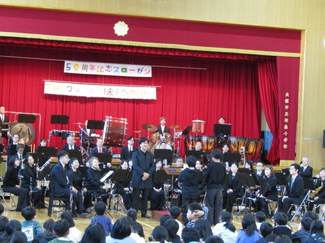 「旅立ちの日に」をオーケストラの伴奏でみんなでうたいました。すごく盛り上がってみんなとても楽しく歌いました。最後に児童代表の子ども達がお礼の言葉を伝えました。今日は八幡屋小学校の子ども達も参加してみんなで楽しい時間を過ごせました。アンコール曲は「宝島」を聞かせてくださいました。