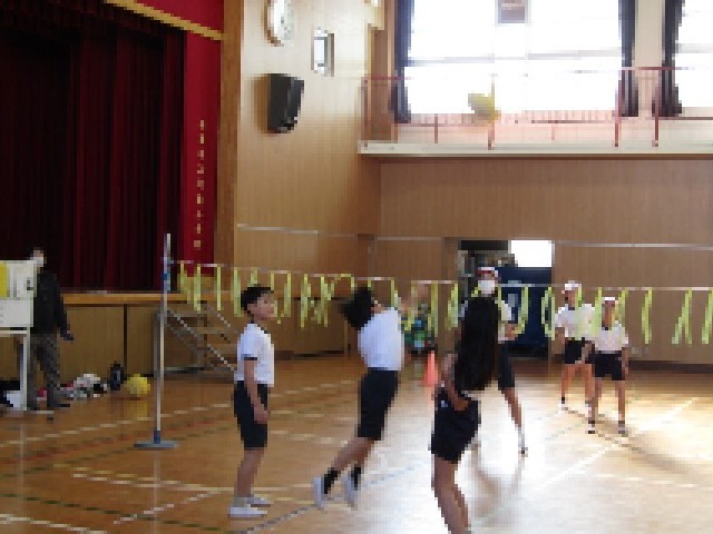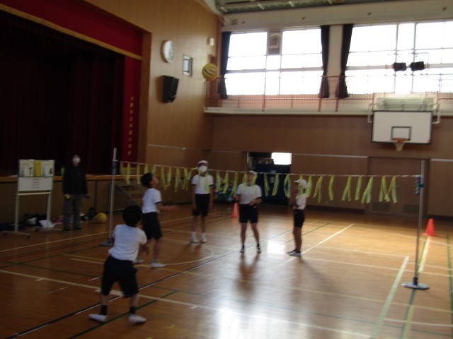 4年生は体育の時間に「キャッチバレーボール」をしていました。ネットを越えてきたボールは二人目まではキャッチをして、3人目の人がアタックします。きちんと決まると、歓声が上がっていました。