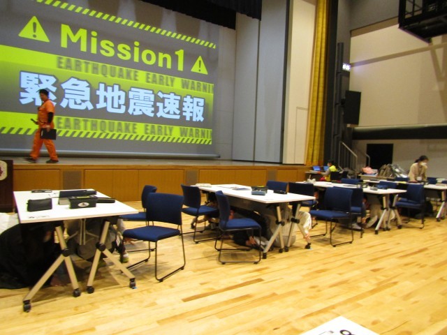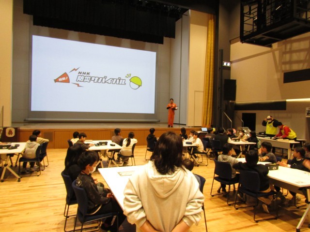 13日(火)5・6年生が「NHK防災サバイバル」に参加しました。港区民ホールで、防災についてなぞ解きをしながら学習します。はじめは巨大地震が発生した時の行動から実践しました。