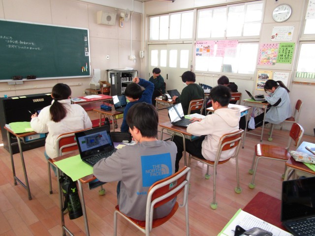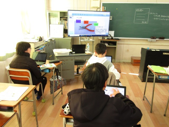 6年生が理科の時間に学習した「てこのはたらき」を身近な道具について発展的に調べたスライドを作っていました。今日は、友達のスライドを見て感想やレビューを書く時間です。