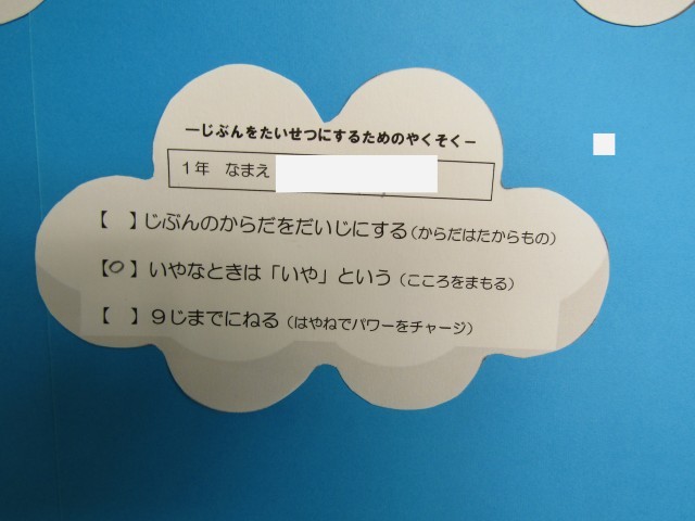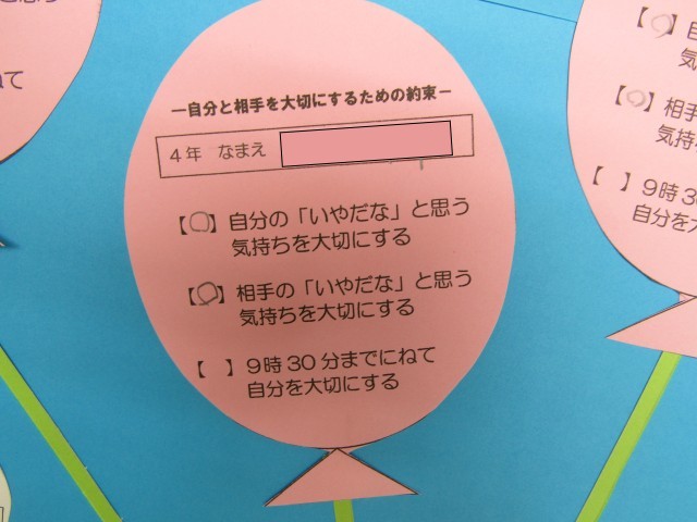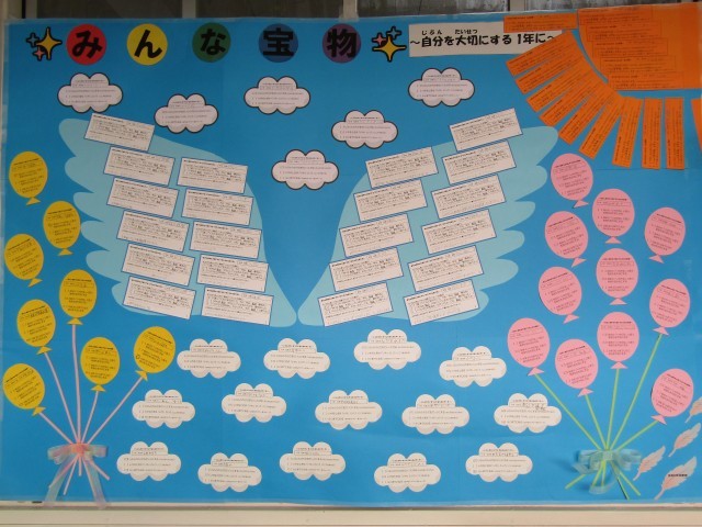 保健室の廊下に「みんな宝物」という大きな掲示物があります。子どもたちが自分と相手を大切にできるようにメッセージを書いたカードを掲示しています。1人1人がとても大切な子ども達です。