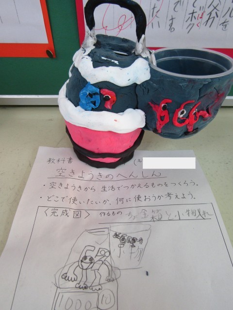 3年生の図工の作品です。空き容器を利用して、自分の思い描いた作品を紙粘土で作りました。設計図通りの作品に仕上がっています。