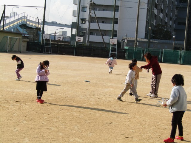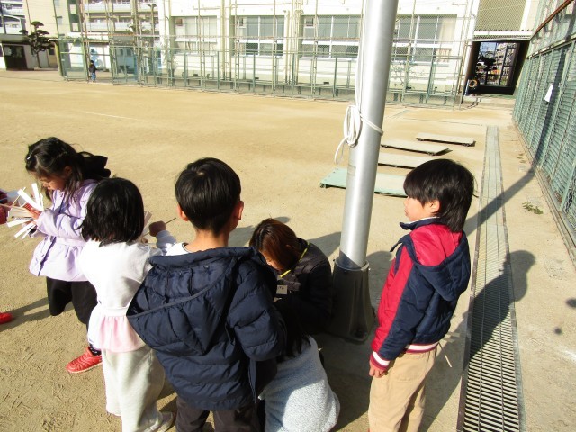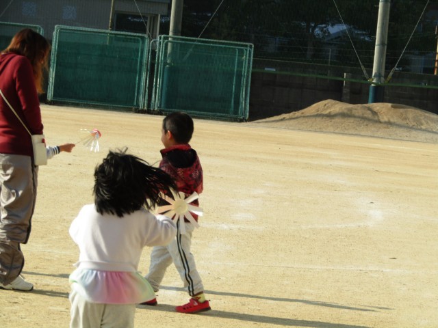 1年生が、生活科の時間につくった風車を回して遊んでいました。どうすればよく回るのか、ピンのさし方や走る方向を考えて遊びます。