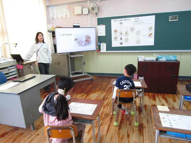 3年生が食育の授業で「大豆のへんしん」を調べていました。大豆を「いる」と入り豆になる。大豆を「煮てしぼると」豆乳やおからになるといったへんしんの様子をマップ上にまとめていました。最後に、納豆ができる様子を動画で見ました。