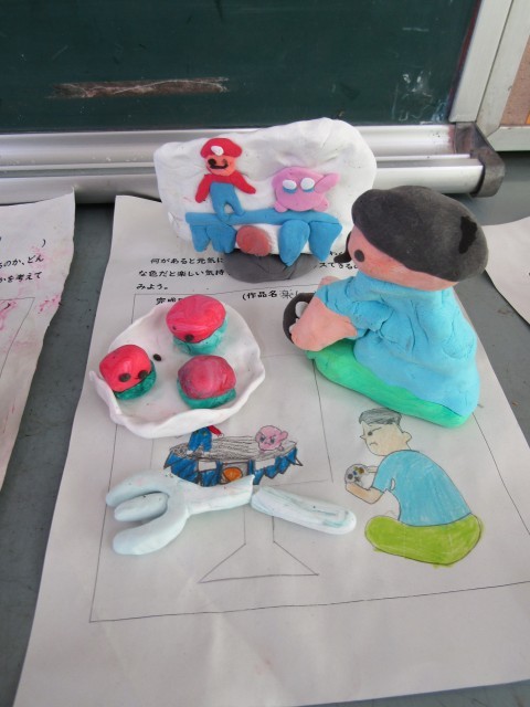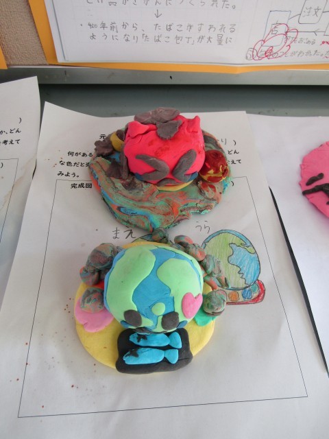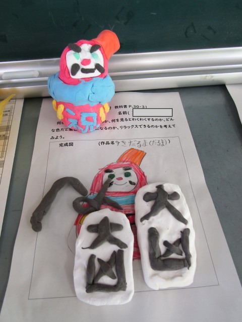 4年生の図工の作品です。紙粘土を使って、設計図通りに作り、絵の具で色をつけました。とてもよく再現できていますね。