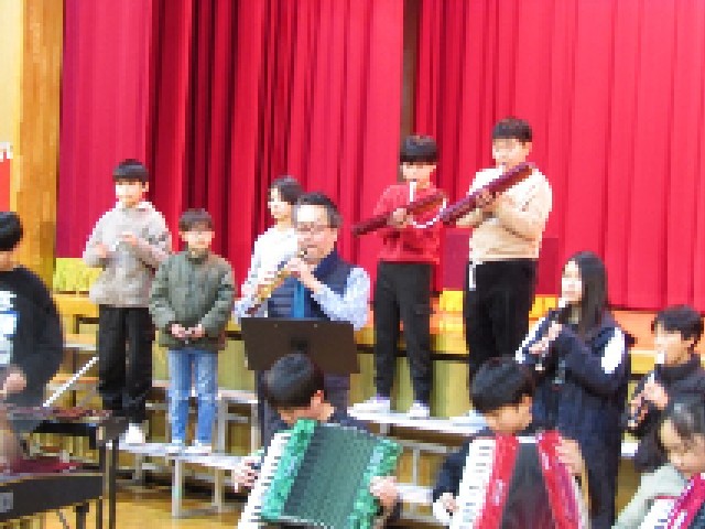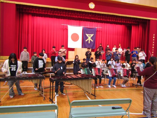 2月13日(金)オーボエ奏者の古部賢一さんをお迎えして、式典のリハーサルをしました。子どもたちは初めてお会いするプロの奏者に緊張していましたが、演奏は練習の成果がかなり出ていました。古部さんの立ち位置を決めたり、演奏パートを確認する間も、緊張したまま待てました。