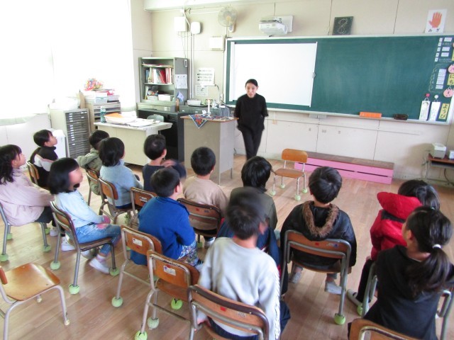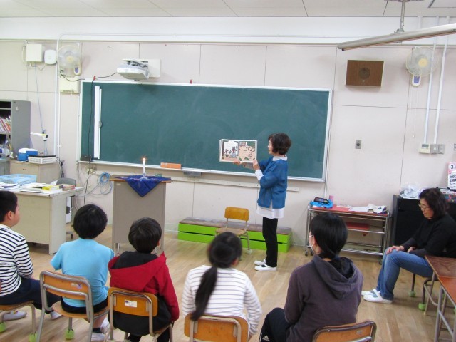 今日は、港図書館の図書ボランティアさんによるお話の会です。2時間目に、1.2.3年生がお話を聞かせていただきました。