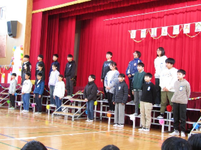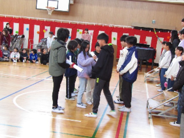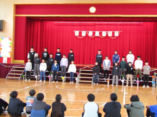 6年生からはお返しに「もっと遠くへ」の歌を聞かせてもらいました。そのあと、6年生から各学年の代表の人に手作りのプレゼントをもらいました。