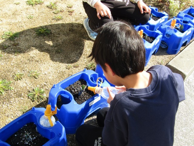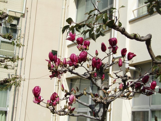学校のモクレンの花が開き始めました。1年生が植えているチューリップも芽を出し、週明けの水やりを友達の分までしている子がいました。