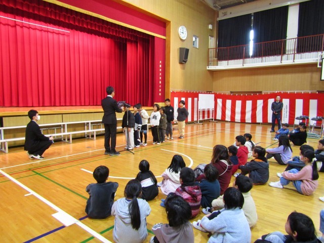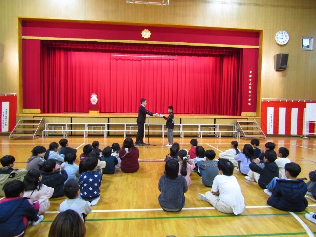 今日は、令和7年度の修了式です。各学年で過ごす最後の1日です。はじめに、ソフトボール部の子どもたちの表彰がありました。つぎに、5年生の代表児童に終了証が手渡されました。校長先生の話、生活指導の話のあと、校歌をしっかり歌いました。