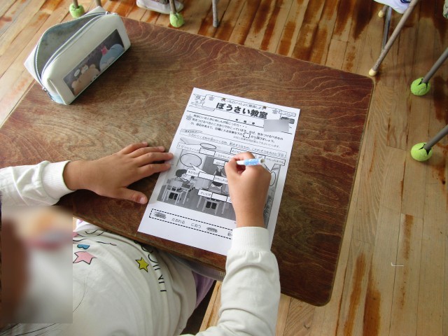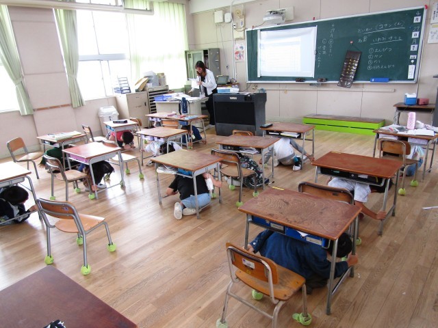 非常ベルが鳴ったら、みんな机の下に隠れて自分の身の安全を確保!