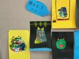 1年生の作品です。広告用紙などをちぎり、できた形から想像を膨らませて作りました...