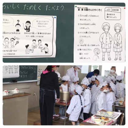 1年生は給食参観です。自分たちだけで食管を運んで、自分たちだけで配膳して、いただ...