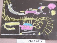 1年生の教室に掲示されていました。黒い画用紙にパスやチョークを使って、線をかいたりぼかしたりして仕上げています。