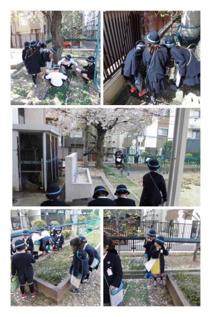 桜、チューリップ、菜の花などいろんな春が見つかりました。石ころの下から冬眠していたダンゴムシも見つかりました。なずなを耳元でくるくる回すと「シャカシャカ」と音が聞こえるのを知っていますか?子どもたちは、春の音も見つけていました!!