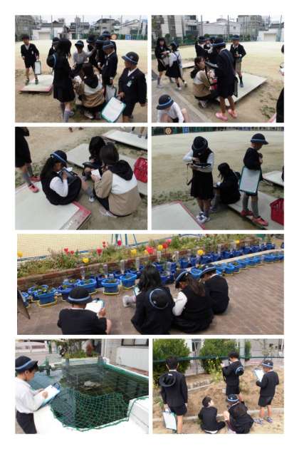 運動場に出ると、チューリップや菜の花が咲いていたり、池では冬眠から覚めた亀が甲羅干しをしていました。見つけたものをタブレット端末で映したり、絵を描いたりして観察していました。中には、キャベツの葉の裏に蝶の卵を見つけて、観察している子もいました!!