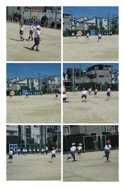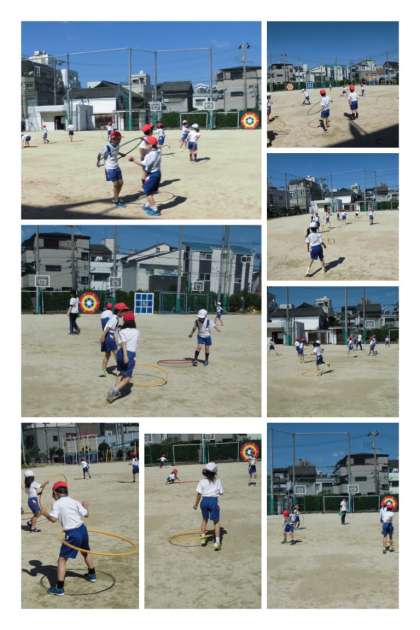 準備運動は、フラフープを使って腰で回したり足で回したり。ベアを組んで一緒に跳んだり転がしたりしていました。じっくりと準備運動をしたあとは「かけっこ」。みんな、頑張って走っていました!!